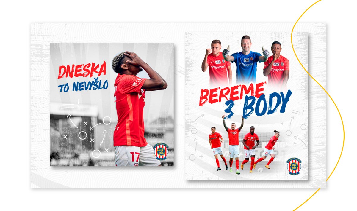 Obsah sociálních sítí většiny sportovních klubů, to jsou především fotografie a videa přímo z akce – ze zápasů a tréninků. My jsme tento obsah proložili návrhy na vizuály pracující s fotografiemi v brandovém provedení, prezentaci statistik, sestav, výsledků a dalších témat tak, aby se celý instagramový a facebookový feed trochu rozbil a nabídl fanouškům něco, co na první pohled chytne jejich oko.