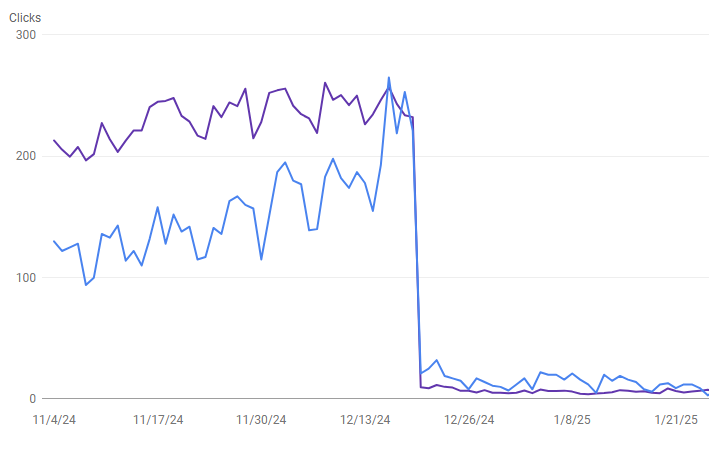 Během jediného dne – z 19. na 20. prosince 2024 – spadla organická návštěvnost webu Lásku dětem prakticky na nulu. Bez varování, bez upozornění v Google Search Console, bez jakékoli změny ve struktuře webu či obsahu. Následný e-mail o poklesu o více než 60 % jen potvrdil, že nejde o drobnou odchylku. Rychlá kontrola v GA a GSC ukázala, že nejsme před drobným výkyvem, ale zásadním algoritmickým zásahem, který odstřihl veškeré dosavadní pozice.