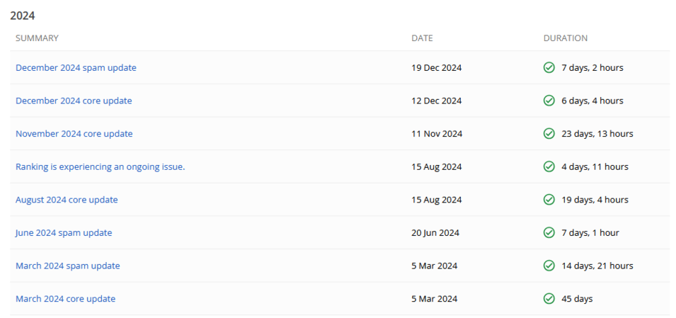 První rychlá analýza byla jasná: musíme zjistit, jestli jsme dostali ruční postih, nebo nás zasáhl algoritmus. V Google Search Console ale svítilo „No issues detected“, takže ruční zásah jsme vyloučili. Zbývala tedy algoritmická varianta – a protože prosinec už jeden velký update měl, nečekali jsme, že přijde další. Jenže Google si to rozmyslel. A 19. 12. 2024 skutečně spustil další rozsáhlý update, který vysvětluje náš náhlý pád.