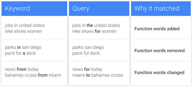Ve zkratce se jedná zejména o změnu práce s klíčovým slovem v přesné shodě, které nebude stoprocentně a přesně odpovídat vyhledávacímu dotazu. Nově se bude reklama zobrazovat, i když se vyhledávací dotaz bude znatelně lišit od klíčového slova v přesné shodě. A nejedná se tu už jen o překlepy nebo diakritiku. Google bude do přesné shody zahrnovat funkční slova, jimiž jsou například předložky nebo spojky. Další novinkou je, že slova nebudou muset být v přesném pořadí. Pak tedy [Autobazar Olomouc] = [Olomouc Autobazar].