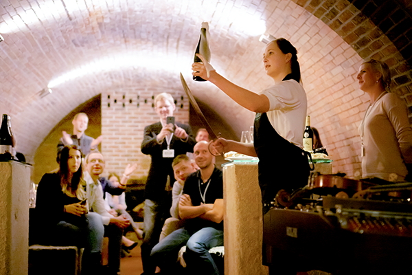 A kde jinde zakončit tak pohodový den než ve sklípku přímo v areálu hotelu Kraví Hora. S klienty jsme poseděli, užili si degustaci vína, výbornou cimbálovku a neuvěřitelnou show sabrage.