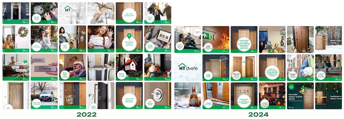 Obsah i brand potřebují pravidelně nakopnout. Přestože v číslech si byznys na nic stěžovat nemůže, značka může snadno ustrnout ve stereotypu, který nikoho nebaví. Takto vypadaly sociální sítě HT dveří před naším zásahem – dlouhá stagnace, která žádné značce neprospívá.