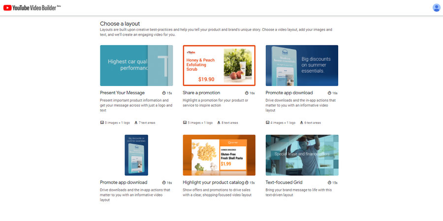 YouTube Video Builder umožňuje firmám, které nechtějí investovat svou energii a finance do tvorby klasických videí, vytvářet jednoduchá videa o délce 6, 15 a 16 vteřin. Díky této krátké stopáži jsou videa ideálním materiálem pro tvorbu video reklam na YouTube a na sociálních sítích. U reklam s délkou 6 a 15 vteřin můžete prostřednictvím kampaní na YouTube využít tzv. nepřeskočitelný formát reklamy a dosáhnout maximální vizibility a pozornosti uživatele.